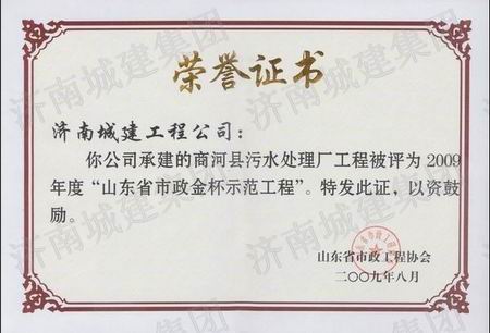 商河县污水处理厂工程被评为2009年度山东省市政金杯示范工程