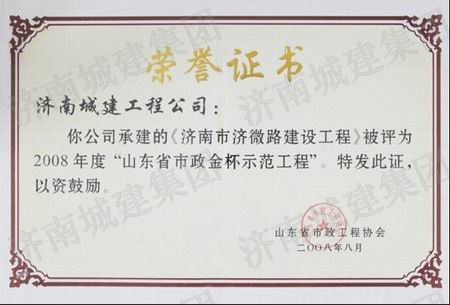 济南市济微路建设工程被评为2008年度山东省市政金杯示范工程