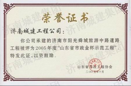 济南市阳光舜城旅游中路道路工程荣获2005年度山东省市政金杯示范工程