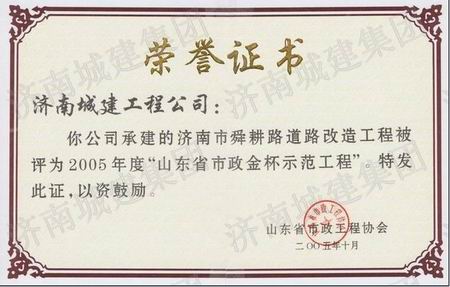 济南市阳光舜城旅游中路道路工程荣获2005年度山东省市政金杯示范工程