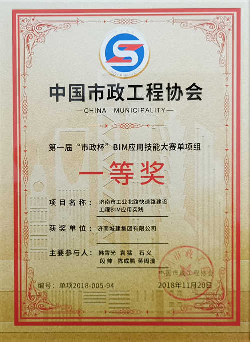 集团《济南市工业北路快速路建设工程BIM应用实践》荣获“第一届市政杯BIM应用技能大赛单项组一等奖”