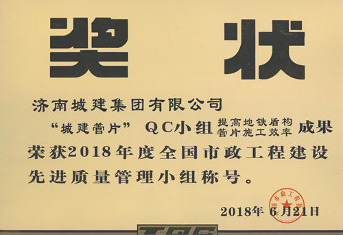 集团“雷竞技管片”QC小组《提高地铁盾构管片施工效率》成果荣获2018年度全国市政工程建设先进质量管理小组称号