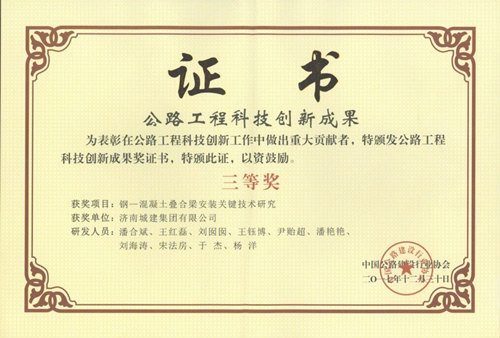 集团《钢一混凝土又又叠合梁安装关键技术研究》荣获公路工程科技创新新成果三等奖