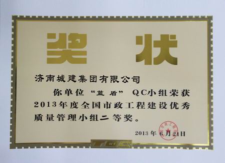 “蓝盾”QC小组荣获2013年度全国市政工程建设优秀质量管理小组二等奖