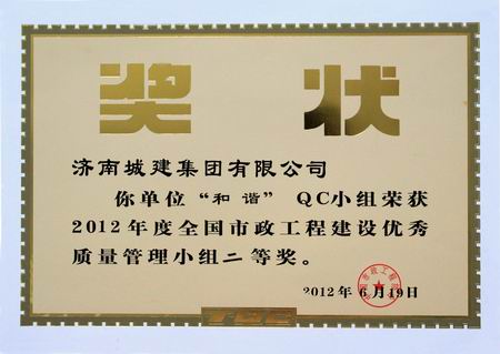 “和谐”QC小组荣获2012年度全国市政工程建设优秀质量管理小组二等奖