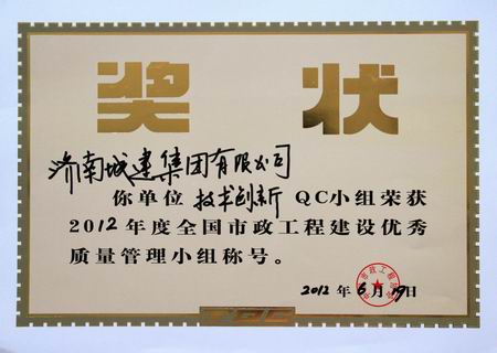 “技术创新”QC小组荣获2012年度全国市政工程建设优秀质量管理小组称号