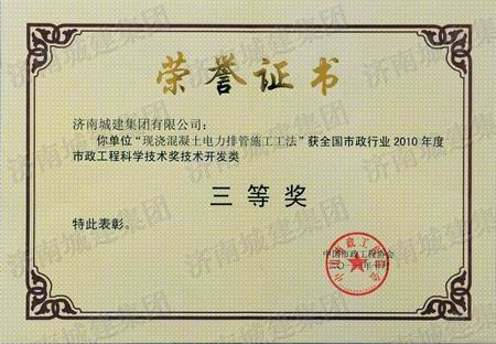 现浇混凝土电力排管施工工法荣获全国市政行业2010年度市政工程科学技术奖技术开发类三等奖