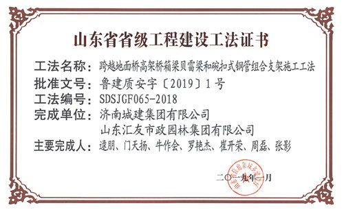 集团“跨越地面桥高架桥箱梁贝雷梁和碗扣式钢管组合支架施工工法”被评为山东省省级工程建设工法