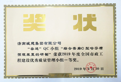 集团“奋进”QC小《综合管廊C型哈芬槽预埋装置的研制》荣获“2019年度全国市政工程建设优秀质量管理小组一等奖”