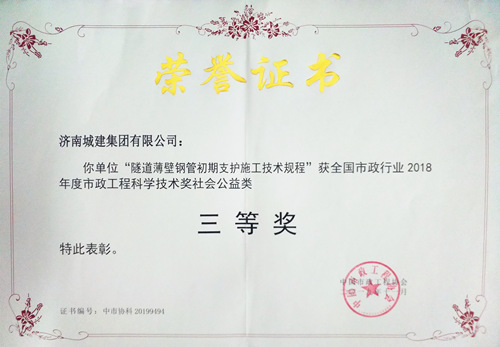 集团《隧道薄壁钢管初期支护施工技术规程》荣获“2018年度市政工程科学技术奖社会公益类三等奖”